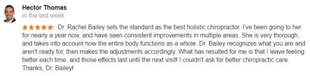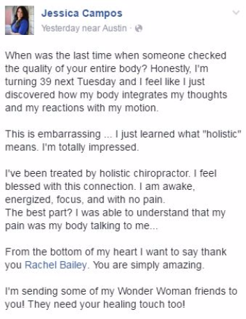 "Dr. Rachel Bailey is truly dedicated to seeing her patients improve, and her care goes far beyond that of the doctor who rushes you in and out of their office. I have seen several Chiropractors over the years, and had varying results. Her methods take into account the entire body, not just your neck or back that are bothering you at the moment, to help the body truly work together as it should. The results are AMAZING! My search for a great Chiropractor is over!" - Jennifer, marketing & design
