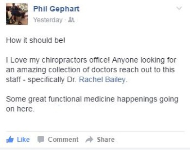 "In the ever changing time of health care, where it's become in many places more of a business model than patient care, Dr. Bailey actually does care about your health. Thanks for your help." - Dr. Hillger, chiropractor